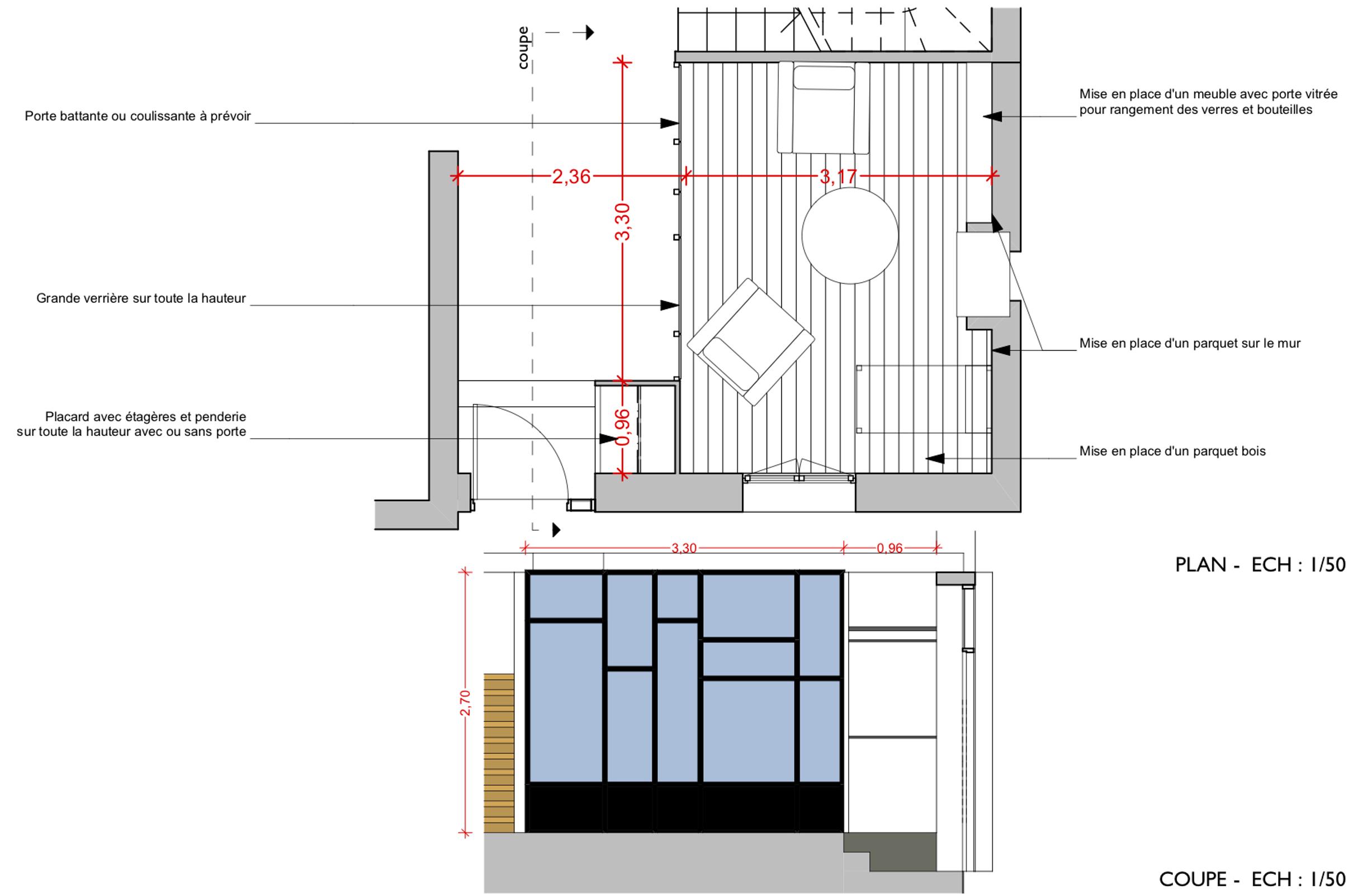 Le projet consiste à l’aménagement d’une pièce environ 20 m2 à l’entrée d’une une maison individuelle. Les clients avaient pour envie de lui donner une fonction particulière et de pouvoir en profiter pleinement. Leur envie, était d’avoir un espace fermé afin de s’isoler du reste de la maison qui est entièrement ouverte (salons, salle à manger et cuisine).